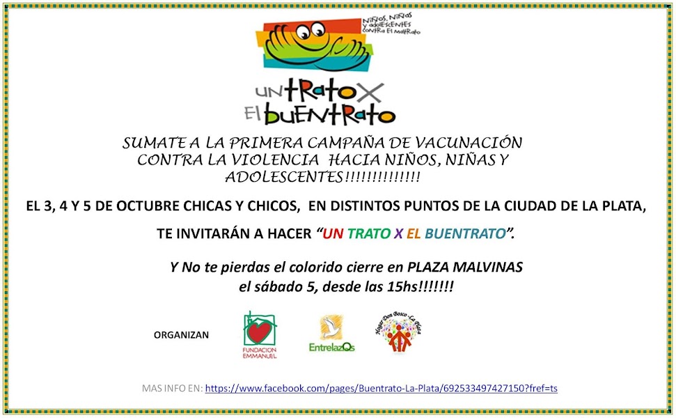 .La Campaña de Vacunación “Un trato x el Buentrato” es una campaña de sensibilización pública sobre las situaciones de violencia cotidiana que sufren niños, niñas y adolescentes en la que ellos/as mismos/as promueven actitudes y conductas respetuosas de su dignidad e integridad.